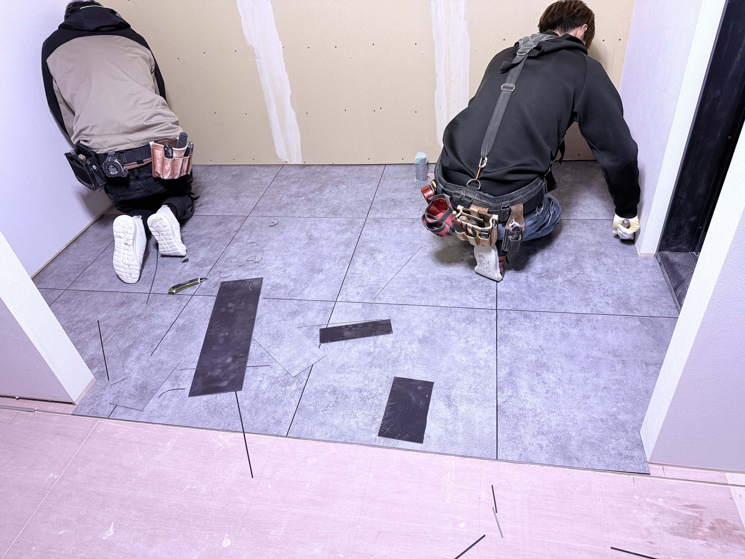 床のタイルにはシンコールの塩ビタイル、60cm角の大きなタイルで目地材に黒を使い高級感アップ⤴️